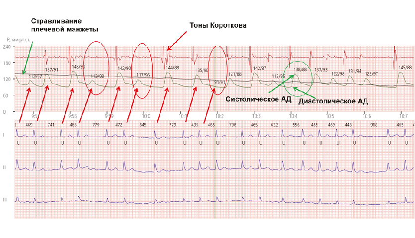 В результате АД вычисляется не по границам возникновения или исчезновения тонов Короткова, а непосредственно путем определения в каждом сердечном сокращении величин максимального (систолического) и минимального (диастолического) по полученной в результате преобразования непрерывной кривой давления.